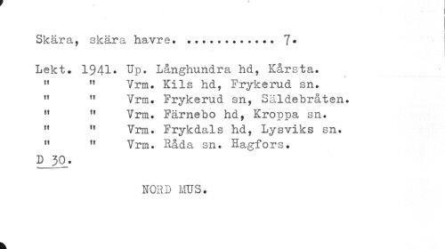 //// Skära, skära havre. ... 7* //// i //// Lekt. 1941* Up. Långhundra hd, Kårsta. //// M tf Vrm. Kils hd, Frykerud sn. //// 11 t! Vrm. Frykerud sn, Säldebråten. //// M M Vrm. Färnebo hd, Kroppa sn. //// 11 11 Vrm. Frykdals hd, Lys viks sn. //// " 11 Vrm. Råda sn. Hagfors. //// D 50. //// NORD MUS. //// t ////