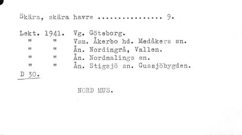 //// Skära, skära havre . ... 9* //// Lekt. 1941» Vg. Göteborg. //// 11 H Vsm. Åkerbo hd. Hedåkers sn. //// 11 11 Ån. Nordingrå, Vallen. //// 11 ,f An. Nordmalings sn. //// M M Ån. Stigsjö sn. Gussjobygden. //// 2 30. //// HORD MUS. ////