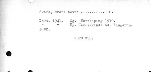 //// Skära, skära havre . ... 10* //// Lekt. 1941. Ög. Norrköping 1910. //// M rt Ög. Hammarkinds hd. Ringarum. //// D JO. //// NORD MUS. ////