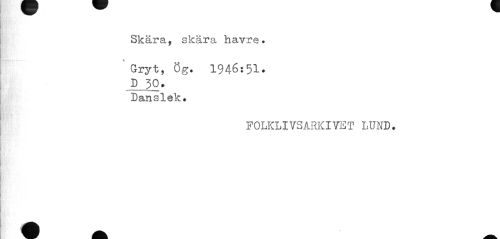 //// Skära, skära havre. //// Gryt, Ög. 1946:51. //// D 30. //// Danslek. //// FOLKLIVSARKIVET LUND. ////