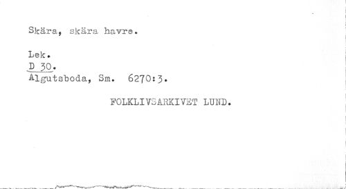 //// i ! //// i //// i //// Skära, skära havre. //// | //// v //// Lek. D 30. //// Algutsboda, Sm. 6270:3. //// FOLKLIVSABKIVET LUND. //// i //// I ////