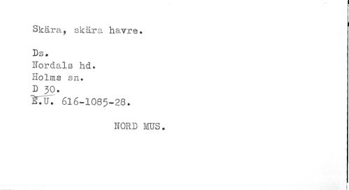 //// i //// Skära, skära havre. Ds, //// Nordals hd, Holms sn. D JO. //// l.U. 616-1085-28. //// HORD MUS. ////