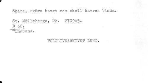 //// Skära, skära havre vem skall havren binda. //// St. Mölleberga, Sk. 2709:5-D 30. //// ingdans. //// FOLKLIVSARKIYET LUND. //// k ////