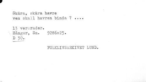 //// Skära, skära havre //// vem skall havren binda ? ... //// 13 versrader. //// - Hånger, Sm. 9236:25* //// "D 30. //// FOLKLIVSABKIVET LUND. ////