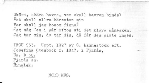 //// Skära, skära havre, vem skall havren binda? ®et skall allra kärestan min Yar skall jag honom finna? //// ^ag såg 'en i går afton uti det klara månesken, Jag tar min, du tar din, då får den siste ingen. //// IFGH 933* Uppt. 1927 av G. Lannestock eft. Josefina Stenbock f. 1847* i Fjärås, - //// Ha. D 30. Fjäras sn. Kinglek. //// nohd mus. ////