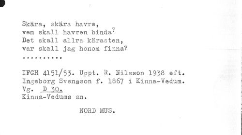 //// Skära, skära havre, //// o //// vem skall havren binda* Det skall allra kärasten, var skall jag honom finna? //// i i //// IFGH 4151/53. Uppt. R. Nilsson 1938 eft. //// Ingeborg S\rengson f. I867 i Kinna-Vedum. i //// Vgl ,D 30». i //// Kinna-Vedums sn. j //// i //// NORD MS. I ////