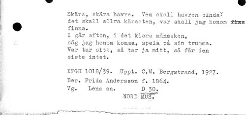 //// Skära, skära havre. Vem skall havren binda'' _ det skall £lllz*cl }CQ*x*cLS ten, var skall jag honom £±xk //// ^P finna. //// I går afton, i det klara månasken, C såg jag honom komma, spela på sin trumma. //// Var tar sitt, så tar ja mitt, så får den siste intet. //// IFGH 1018/39* Uppt. C.M. Bergstrand, 1927. //// Ber. Frida Andersson f. 1864» Vg. Lena sn. D 30. //// NORD MTTÉ7 //// V. « »- •-•>. .. ... ... i. //// t . ^ . —,—,---•—---— --- ////