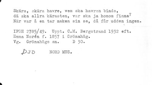 //// Skära, skära havre, vem ska havren binda, dä ska allra kärasten, var ska ja honom finna-När var a en tar maken //// s in s e, da far udden ingen» //// IFGH 2785/49* Uppt* C.M. Bergstrand 1932 eft. Emma Norén f. 1857 i Grönahög. Vg. Grönahögs sn. D 30* //// PJD NORD MUS. //// t ////