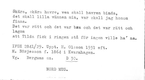 //// I j //// Skära, skära havre, vem skall havren binda, 1 //// det skall lilla vännen min, var skall jag honom finna» //// Det var rätt och det var bsa och det var rätt och lagom //// att Tilda fick. i ringen stå för ingen ville ha' na* //// IFGH 2841/29. Uppt. H. Olsson 1931 eft. M. Börjesson f. I864 i Kvarnhagen. //// Vg. Bergums sn. D 30. //// NORD MUS. 1 //// 'V».'" 1WJ. Vi. ////