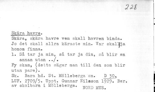 //// 2U //// B //// r //// Skära havre. //// Skära, skära havre vem skall havren binda. //// Jo det skall allra käraste min. Yar skalljja //// honom finn a. ' //// 1. Så tar ja min, så tar ja din, så blir en //// annan utan ../? //// Fy skam, (detta säger man till den som blir - //// utan pare). ^ //// Sk. Bara hd. St. Mölleberga sn. D Q. I //// LUF. 2709/5- Uppt. Gunnar Nilsson 1929. Ber. ] //// av skolbarn i Mölleberga. ^/vn-n ^.m-o \ ////