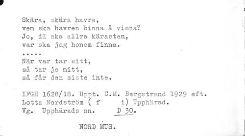 //// Skära, skära havre, i //// vem ska havren binna å vinna? //// r //// Jo, dä ska allra kärasten, //// var ska jag honom finna. i //// \ //// När var tar sitt, så tar ja mitt, //// så får den siste inte. i //// < //// IFGH 1628/18. Uppt. G.M. Bergstrand 1929 eft. Lotta Nordström ( f i) Upphärad. Vg* Upphärads sn. D JO. //// NORD MUS. ////