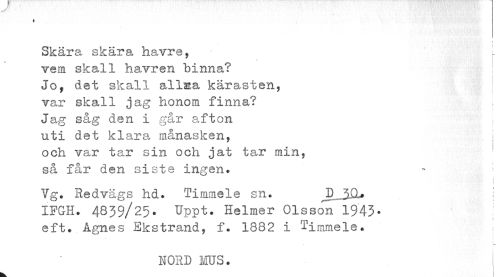 //// I //// r //// Skära skära havre, //// vem skall havren binna? //// Jo, det skall all&a kärasten, //// var skall jag honom finna? , //// Jag såg den i går afton //// uti det klara månasken, j //// och var tar sin och jat tar min, 1 //// så får den siste ingen» //// i //// Vg. Hedvägs hd. Timmele sn. 3£L» i //// IFGH. 4839/25. Uppt. Helmer Olsson 1943- //// eft. Agnes Ekstrand, f. 1882 i ^immele. j //// NORD MUS. ////