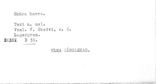 //// 1 j //// Skära havre* i //// v //// I f //// Text nu mel. i //// i //// Vsml. V. Skedvi, s. 6. //// Lagergren. //// XXPX D 30» | //// i ! //// ULMA SÅNGLEKAR. //// I ; //// i //// i i ////