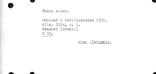 //// Skära havra. //// Omnämnd, i bröllopskväde 1701. Allm. 2324, s. 1. //// Dencker (avskr.) //// ULMA SÅNGLEKAR. ////