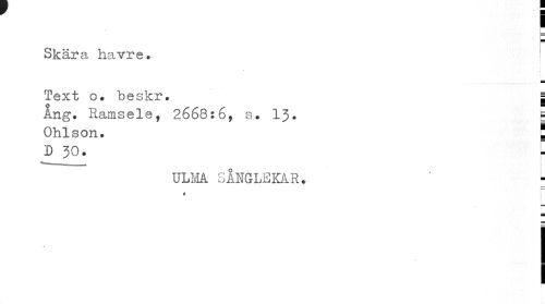 //// I //// I //// Skära havre. //// Text o. beskr. | //// Ång. Ramsele, 2668:6, s. 13. ! //// Ohlson. I //// D 30. //// ULM SÅNGLEKAR. //// - //// 1 //// i i ////