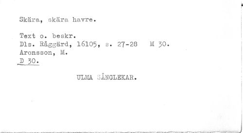 //// r //// Skära, skära havre. //// | //// Text o. beskr. //// Dis. Råggärd, 16105, s. 27-28 M JO. Aronsson, M. //// J) 3 0. //// t i //// ULM SÅNGLEKAR. //// i //// t ////