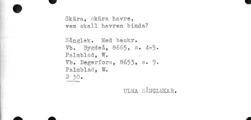 //// Skära, skära havre, vem skall havren binda? //// Sånglek. Med beskr. //// Vb. Bygdeå, 8665, b. 4-5 • //// Palmblad, W. //// Vb. Degerfors, 8655» s. 9-Palmblad, W. //// D ?0. //// ULM SÅNGLEKAR. ////