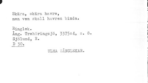 //// j ¦ //// Skära, skära havre, //// men vem skall havren binda. //// i //// E //// Ringlek. ! //// Ang. Trehöringsjö, 3575:4, s. 8. j //// Sjölund, E. j) 50. //// ulm sånglekar. ^ //// I //// i i ////