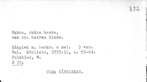 //// i //// I //// v //// Skära, skära havre, vem ska havren binda. //// Sånglek m. beskr. o mel. 3 var. //// Vml. Möklinta, 2795:11, s. 59-64- //// Palrablad, W. s //// D 30. ! //// i //// ulma. sauglekas. | //// I //// P //// tZ //// I //// I ¦ ////