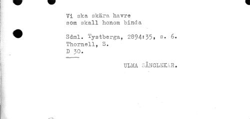 //// Yi ska skära havre som skall honom binda //// ^ Sdml. r%stberga, 2894:35, s. 6. //// Thornell, S. D 30. //// A //// ULMA SÅNGLEKAR» ////