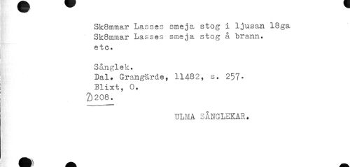 //// Sk8mmar Lasses smeja stog i "ljusan 18ga Sk8mmar Lasses smeja stog å brann, e to. //// Sånglek. //// Dal. Grangärde, 11482, s. 257-Blixt, 0. 2)208. //// ULMA SÅNGLEKAR. ////