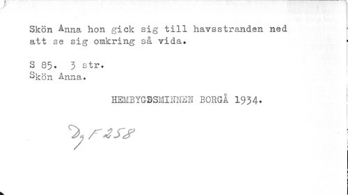 //// Skön Anna. hon gick sig till havsstranden ned att se sig omkring så vida. //// S 85. 3 str. //// Skön Anna. //// HEMBYGBSMIMEIJ BORGA I934. //// % fätt I //// / | //// 1 l //// i ¦ //// i i i //// I ////
