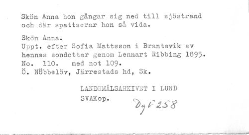 //// Skön Anna hon gångar sig ned till snöstrand och där spattserar hon så vida. //// Skön Anna. //// Uppt. efter Sofia Mattsson i Brantevik av hennes sondotter genom Lennart Ribbing 1895* No. 110. med not 109. ö. Nöbbelöv, Järrestads hd, Sk. //// LAND3MALSARKIVET I LUND //// SYAICop. c. //// 2>« h 8 ////