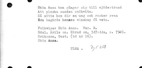 //// ^^ Skön Anna hon gångar sig till sjödestrand //// Att plocka sanden snöhvita. Så mötte hon där en ung och rasker sven Söm begärde hennes vänskap få veta. //// Folkvisa; Skön Anna. Var. B. //// Sdml. Arila sn. Härad sn, 347:44&> s. 7961• //// Eriksson, Gust. (bd nr 16). //// Skön Anna. //// ULMA . ^jTZtå ////