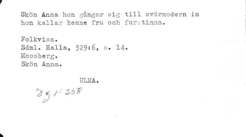 //// Skön Anna hon gångar sig till svärmodern in j //// hon kallar henne fru och furstinna. //// Folkvisa. //// Sdml. Halla, 329:6, s. 14- //// Mossberg. //// Skön Anna. //// ULMA. //// ^ c r //// * //// k, ////