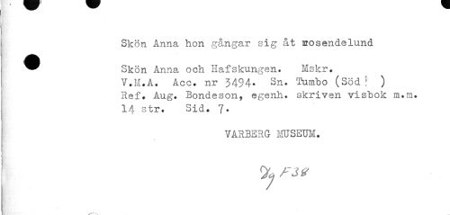 //// Skön Anna hon gångar sig åt sosendelund ^^ Skön Anna och Hafskungen. Mskr. //// V.M.A. Acc. nr 3494- Sn. Tumbo (Söd? ) //// Ref. Aug. Bondeson, egenh. skriven visbok m.ra. //// 14 str. Sid» 7. //// VARBSRG MUSEUM. //// Vy FZtt ////
