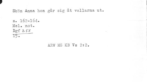 //// 5 //// Skön Anna hon går sig åt vallarna ut. | //// : //// S. 162-164» ! //// Mel. not. //// Dgf | //// i //// ARW MS KB Vs 2:2. //// i //// i ////