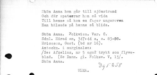 //// Skön Anna hon går till sjöastrand Och där spates&rar hon så vida Till henne så kom en fager ungersven Han hälsade på henne så blida. //// Skön Anna. folkvisa. Var. C. Sdml. Härad sn, 347-* 44 a, s. 83-88. Ericsson, Gust. (bd nr 16). Anteckn. i marginalen: ^^ /Se: Afzelius, nr 5 også; trykt som flyve- //// blad. (Se Danm. gl. Folkev. V, 13/* Skön Anna. //// ULMA. ////