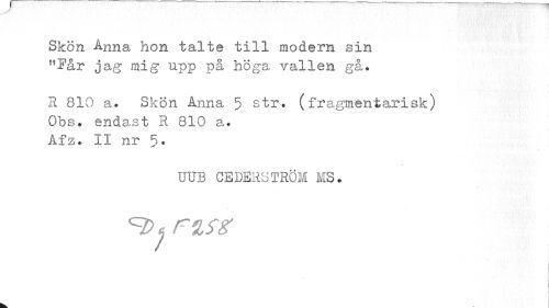 //// Skön Anna hon talte till modern sin MPår jag mig upp på höga vallen gå. //// R 810 a. Skön Anna 5 str. (fragmentarisk) Obs. endast R 810 a. Afz. II nr 5. //// UUB CEDERSTRÖM MS. //// : ' ' i C //// q ////