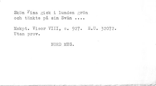 //// Skön ^'ina gick i lunden grön och tänkte på sin Svän ... //// Mskpt. Visor VIII, s. 92?. E.U. 52072. Utan prov. //// HORD MUS. ////