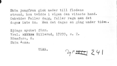 //// Skön jungfrun gick neder till flodens //// strand, hon tvådde i vågen den vitaste hand. ¦ //// Omkväde: Faller dagg, faller regn men det i //// dagas inte än. Men det dagas en gång under tiden• | //// Sjöngs mycket förr. //// Vrml. xxiirs Sillerud, 17299? s. 2. //// Rönnfors, E. //// Skön Anna. //// ULMA. _ o y i //// tyf&za m i ////