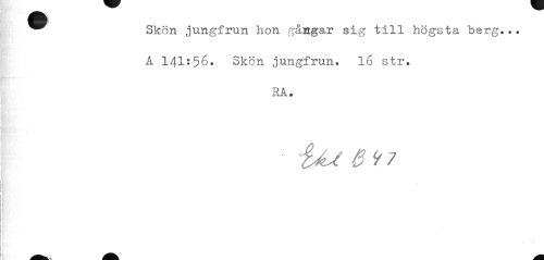 //// ^^ Skön jungfrun hon gångar sig till högsta berg... //// A 141:56» Skön jungfrun. 16 str. //// ra. ////