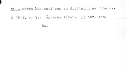 //// Skön Märta hon satt som en drottning på tron i.. B 98:2, s. 99. Ångerns tårar. 33 str. kom. //// HÅ. ////