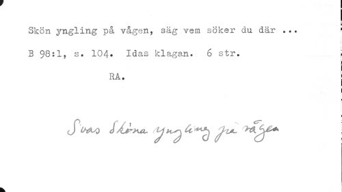 //// I //// Skön yngling på vågan, säg vem söker du där ... i //// B 98:1, s. 104» Idas klagan. 6 str. \ //// rå. | //// r 1 //// t i //// ! //// I //// JW> y*^ ^^ ^h*- //// k ////