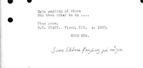 //// Skön yngling på vågen Säg hvem söker du än ... //// Utan prov. //// E.U. 20407. Visor, III. s. 1023. //// hord mus. //// jWo Sk^Vi*- ykp^ ^jOc. ////