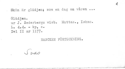 //// Skön är glädjen; som en dag om våren ... Glädjen. //// ur J. Sederbergs visb. Muttas., Iskmo. //// L. 4*4* - kp, s. //// Del II nr 1177. //// RÅNCKEH FÖRTECKNING. //// vj Ih?LO ////