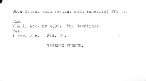 //// Skön östan, skön västan, skön innerligt fri ... Rim. //// V.M.Å. Acc. nr 4390* Sn. Harplinge. Ref. //// 1 str. 2 v. Sid. 21. //// VÅRBERG MUSEUM. ////
