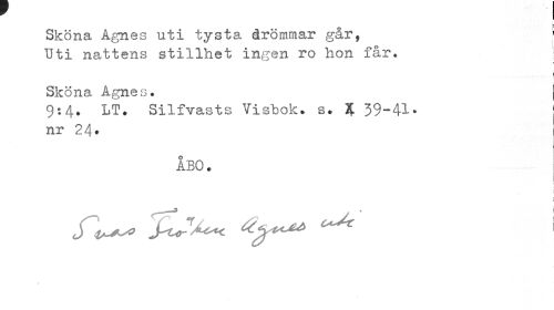 //// Sköna Agnes uti tysta drömmar går, ' //// Uti nattens stillhet ingen ro hon får. //// ? //// i //// f //// Sköna Agnes. j //// 9:4. LT. Silfvasts Visbok, s. $ 39-41- i //// nr 24. //// ÅBO. //// i \ ////