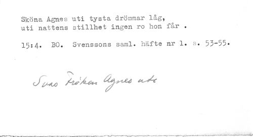 //// Sköna Agnes uti tysta drömmar låg, uti nattens stillhet ingen ro hon får . //// 15:4. BO. Svenssons saml. häfte nr 1. s. 53-55. //// * ////