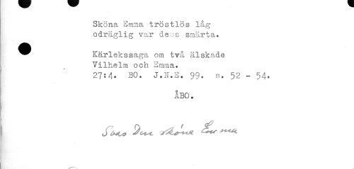 //// Sköna Emma tröstlös låg odräglig var de os smärta. //// ^^ Kärlekssaga om två älskade //// Vilhelm och Emma. //// ? //// 27:4. BO. J.U.S. 99. s. 52 - 54. //// åbo. ////