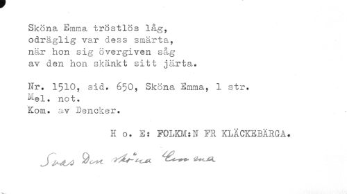 //// Sköna Emma tröstlös låg, odräglig var dess smärta, när hon sig övergiven såg av den hon skänkt sitt järta. //// Hr. 1510, sid. 65O, Sköna Emma, 1 str. //// 1VLel. not. Kom. av Dencker. //// H o. E: FDLKM:M FR KLÄCKEBARGA. ////