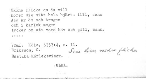 //// Sköna flicka om du vill i //// horer dig mitt hela hjärta till, sann ! //// Jag är öm och trogen och i kärlek mogen //// tycker om att vara hav och gill, sann. • •tit //// Vrml. Kola, 3357:4» s. 11. //// Eriksson, G. ^JcAa //// Enstaka kärleksvisor. //// •ULMA. ////