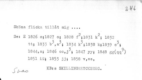 //// iVi //// Sköna flicka, tillåt mig ... ? //// ? K/ . -V v. //// Se: E 1826 o;1827 o;.1328 f2;1831 k2; 1832 //// ttj 1833 b",a5; 1834 k5;1838 k;1839 c5; 1844,S} 1846 cc,j5i 1847 yy; 1848 gg(qq9) 1851 iij 1853 jjj 1858 v,ee, //// » //// KB:s SKILLINGRRYCKSEEG. //// J l^o ////