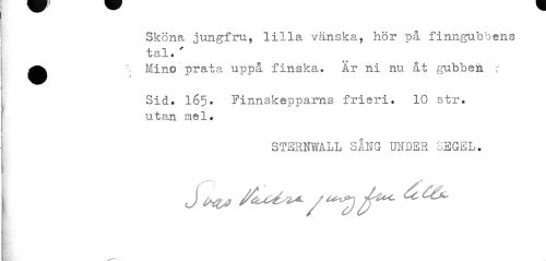 //// Sköna jungfru, lilla vänska, hör på finngubbens is ci 3- • //// ^^ c> Mino prata uppå finska. År ni nu åt gubben i //// Sid. 165» Finnskepnarns frieri. 10 str. utan mel. //// 3terhwall såhg under segel. //// I J /bcéf - ////