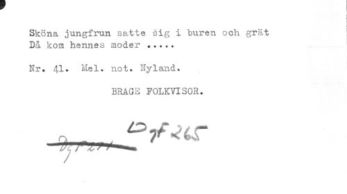 //// Sköna jungfrun satte åig i "buren och grät Då kom hennes moder ... //// Nr. 41» Mel. not. Nyland. //// BRÅGK FOLKVISOR. ////