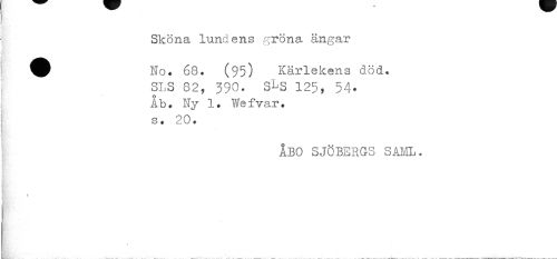 //// Sköna lundens gröna ängar //// No* 68. (95) Kärlekens död. SLS 82, 390. S^S 125, 54. //// ib. Ny 1. Wefyar. //// s. 20. //// ÅBO SJÖBERGS SAML. //// t ////